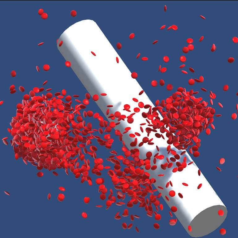 One of my favourite moments in the project happened by accident. I was building a blood cell flow simulator in Unity3D, stress-testing the physics by cranking up the particle count. The red blood cells started clumping around a vessel wall junction.