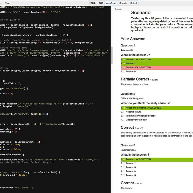 Coding the new Ward Round online quiz engine. My original attempt to bring the Ward Round app to the web. JavaScript generating randomised clinical scenarios with multiple-choice answers, category tagging (Treatments, Differential Diagnosis, Investigations), and even a "Partially Correct" scoring system. Medical questions about acute cholecystitis and everything. Got it working but never finished it. The app version kept going though.