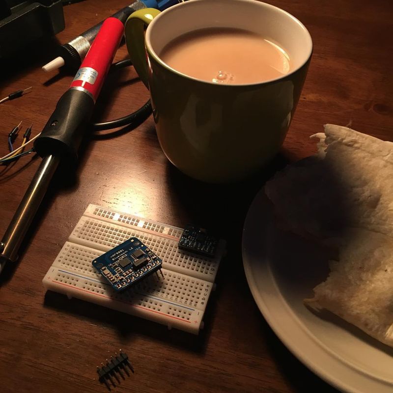 Maybe early morning electronics can become as big as aerobics. Soldering iron, breadboard, Bluetooth LE module, cup of tea and a pastry. The essentials.