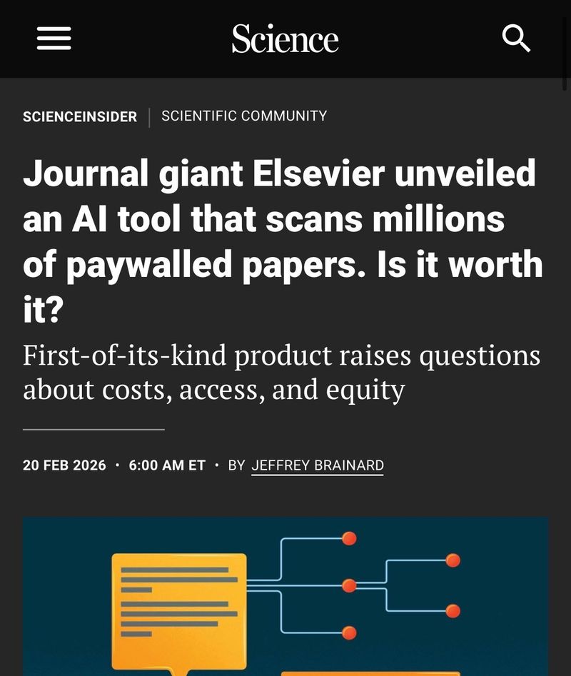Pretty proud moment for me. It’s a fair and balanced review all in all. Good is places I’m happy about and work needed in others. Overall really excited it seems to resonate overall. https://www.science.org/content/article/journal-giant-elsevier-unveiled-ai-tool-scans-millions-paywalled-papers-it-worth-it